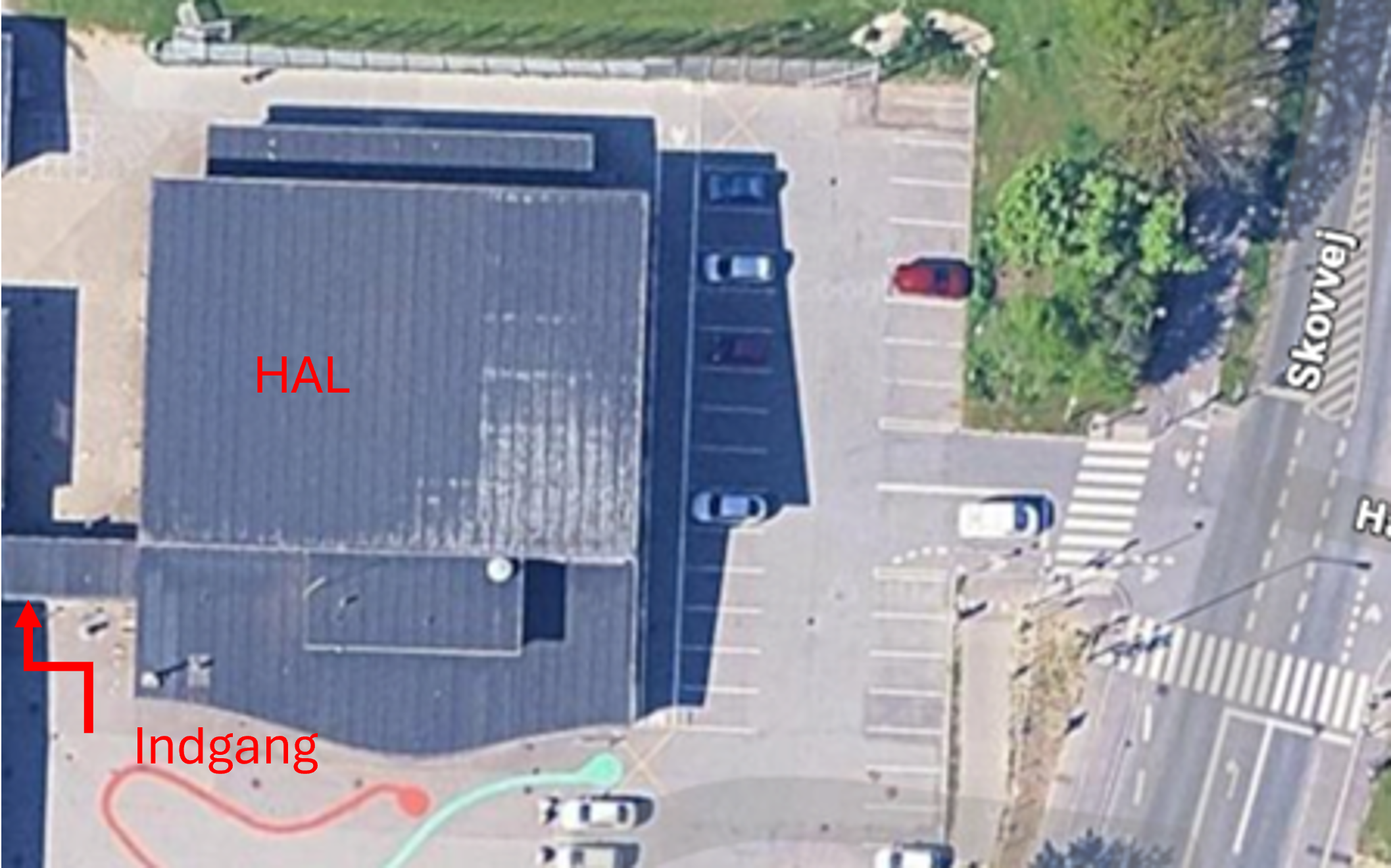 Helt ned i bunden af P-pladsen og ned ad trappen til højre.